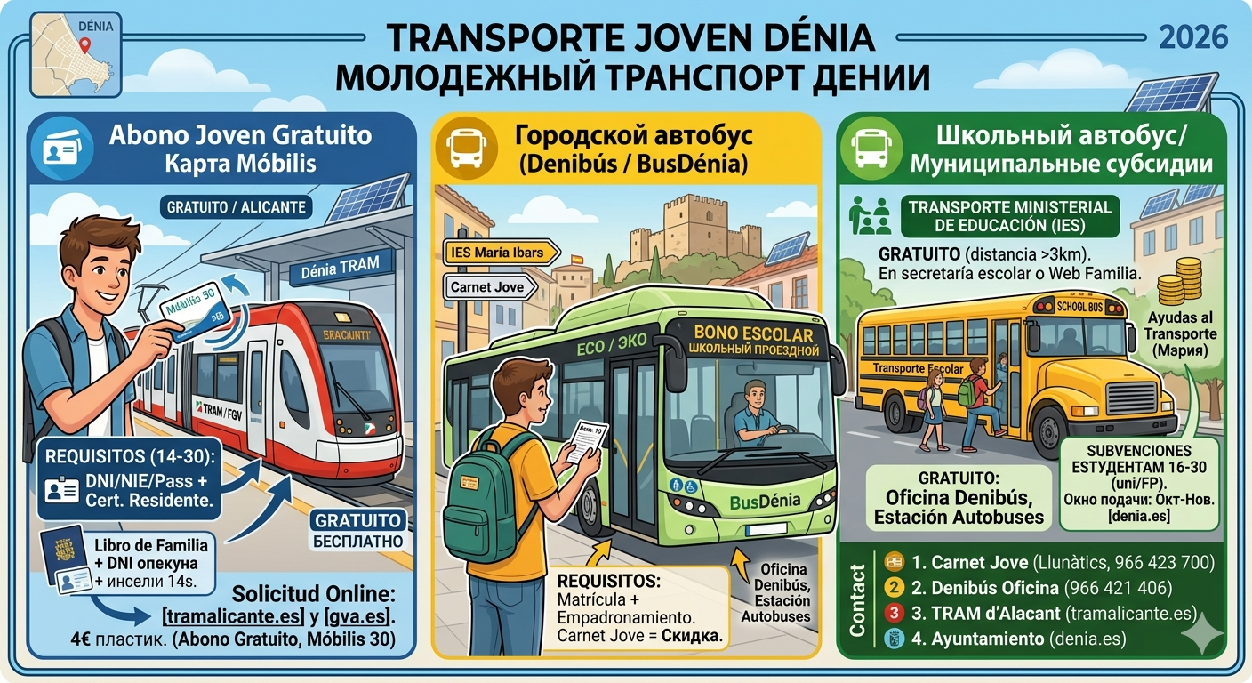 В Дении (и вообще в регионе Валенсия) система проездных для молодежи до 30 лет довольно гибкая. Главное — разделять городские автобусы (по самой Дении), междугородние (в Аликанте, Валенсию) и специальные субсидии от мэрии.